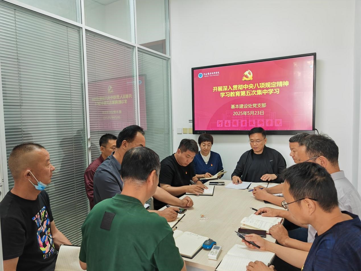 5月23日上午,学校基本建设处党支部在行政楼322会议室组织开展了深入贯彻中央八项规定精神学习教育第五次集中学习会。会议由支部书记吴玉刚主持,全体党员参加学习。