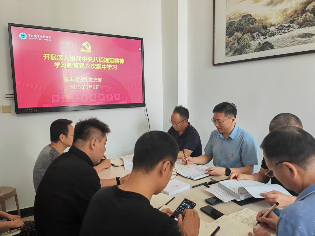 6月9日上午,学校基本建设处党支部在行政楼322会议室组织开展深入贯彻中央八项规定精神学习教育第六次集中学习会。会议由支部书记吴玉刚主持,全体党员参加学习。