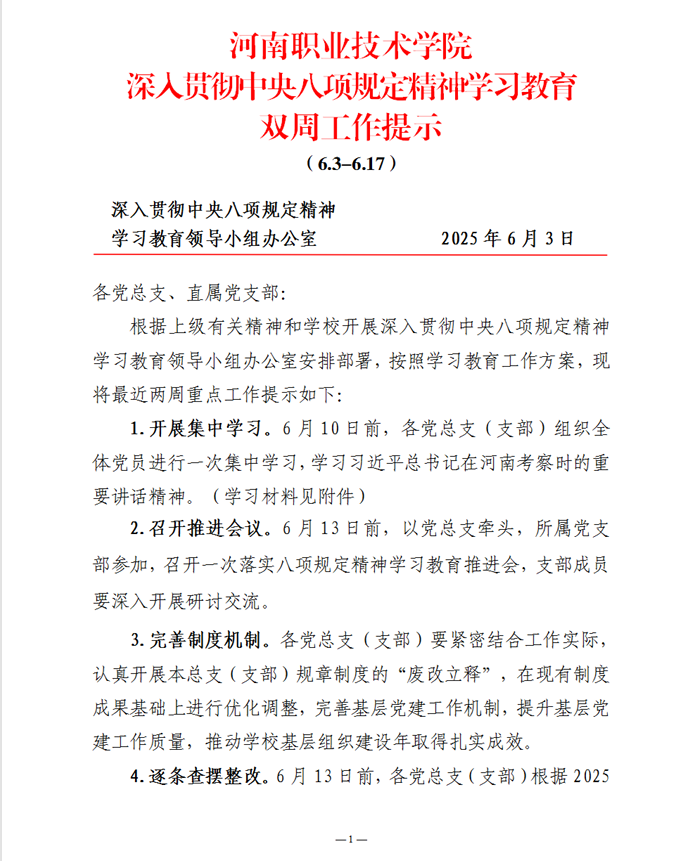 河南职业技术学院深入贯彻中央八项规定精神学习教育双周工作提示