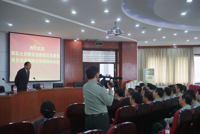 9月27日下午,在行政楼圆形会议室,学院王爱群院长、肖珑副院长接待了由军队总参谋部组织的职业技能鉴定质量督导员培训班的110多名官兵。