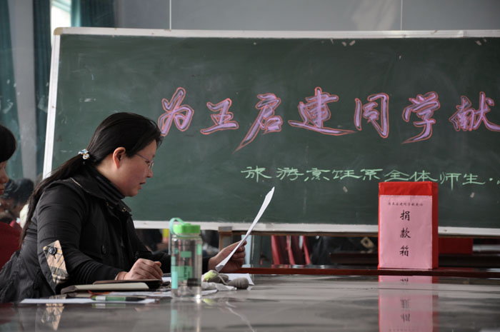 王启建系该系07级学生,近日被北京大学人民医院确诊为“急性骨髓性白血病”,治疗费用保守估计需50万元。王启建同学的父母都是农民,以种地为生,没有其它的经济来源,家里还有一个正在上大学的妹妹。为了供养王启建和妹妹上大学,家里已经负债累累。王启建同学身患白血病对这个本来就很贫困的家庭来说无疑是一场天大的灾难。得知消息后,系党总支和团总支分别向全系师生发出了向王启建同学献爱心捐款倡议,同学们纷纷伸出援助之手,其中有很多家庭并不富裕的学生,把自己平时积攒的零用钱都拿了出来。全体教职工及学生代表在现场纷纷解囊,短短一个小时就募捐善款12190.5元,用实际行动诠释了爱的真谛,体现了旅游烹饪系这个大家庭的温暖。