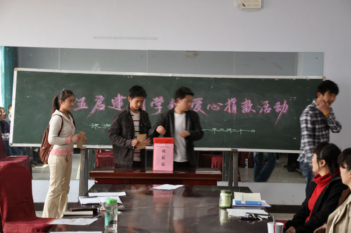 捐款仪式上,系主任刘志全同志代表师生表达了对王启建同学的深切关爱之情。他说,善款的数目虽然不大,但却表达了全系师生诚挚的爱心。他还委托教师代表要尽快将爱心捐款送到王启建同学手中,鼓励该同学树立信心,战胜病魔,早日康复。