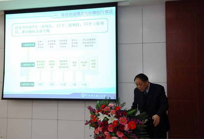 3月14日到15日,河南省教育厅、财政厅组织以上海市教育科学研究院副院长马树超为组长、新疆农业职业技术学院院长王毅为副组长、教育部职业技术教育中心研究所所长助理姜大源、中国机械工业教育发展中心副主任陈东、河南工业职业技术学院院长李生平、黄河水利职业技术学院副院长孙五继、平顶山工业职业技术学院副院长李树伟为成员的7人专家组对我院的国家示范性高等职业院校建设项目进行省级验收。