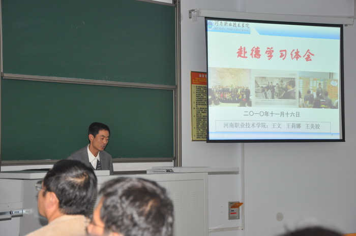 在汇报会上,教务处长王卫平教授、机电系副主任李伟教授、机电系数控技术教研室主任赵军华副教授和汽车工程系实训中心王文副主任等四位学员就赴德培训的内容、学习体会以及差异比较等分别进行了专题汇报。他们用充满激情的语言、图文并茂的课件,展示了德国职业教育丰富多样的行动导向教学法,工作过程系统化的课程开发理念,立交桥式的教育体系结构等进修学习的收获和成果,向大家讲述了培训前后认识的转变。整场汇报气氛热烈,与会教师强烈地感受到异域教育文化的冲击,为我院向纵深推进校企合作、工学结合、顶岗实习人才培养模式创新和教育教学改革开拓了思路。