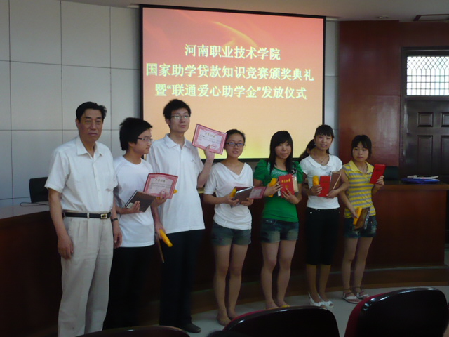 6月25日上午,我院在行政楼圆形会议室举行了国家助学贷款知识竞赛颁奖暨联通爱心助学金发放仪式。院党委书记杨寿亭、后勤处处长武新胜、各系党、团总支书记、学生工作部工作人员、学生代表及辅导员参加了会议。会上,对获奖的旅游烹饪系、汽车工程系两个单位和张明超等21名学生进行了表彰,向张永英等10名学生颁发了联通爱心助学金。