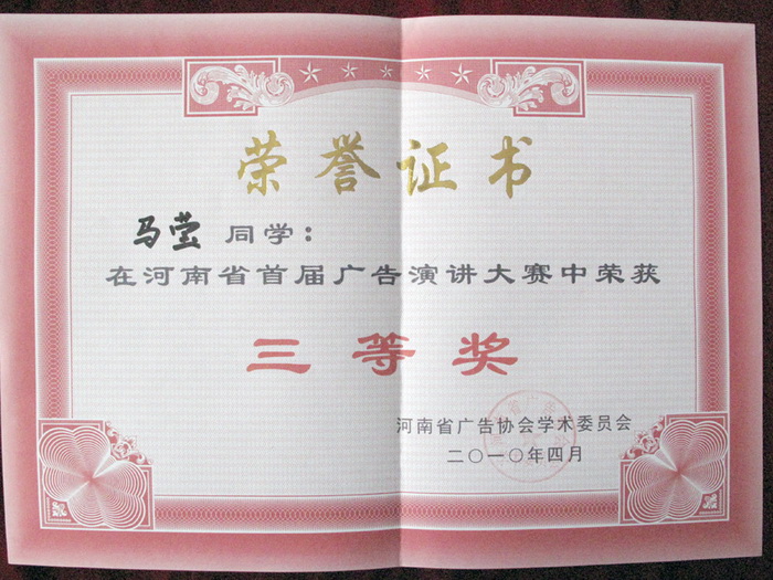 本届大赛经过一个多月的初赛后,有郑州大学、河南财经学院、河南职业技术学院等十所代表队参加决赛。我院广告策划专业08级马莹同学以《理想引领广告未来》的演讲进入复赛后,又以《中国创意,智领天下》为题,以声情并茂的台风和简练优美的语言,荣获广告演讲比赛三等奖;该系广告策划专业08级马莹、赵洋等同学组成的代表队,经过周密的策划和形式多样的促销活动,获得本届高校广告专业实战比赛团体冠军,该系荣获了“优秀组织奖”,赵永立老师荣获商业实战环节“优秀指导奖”称号。