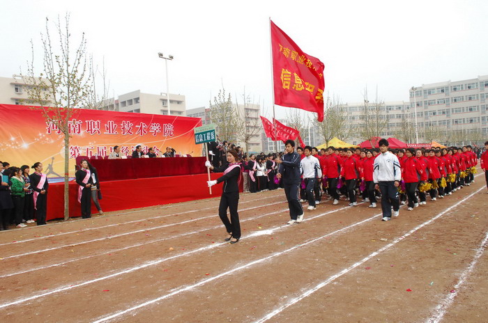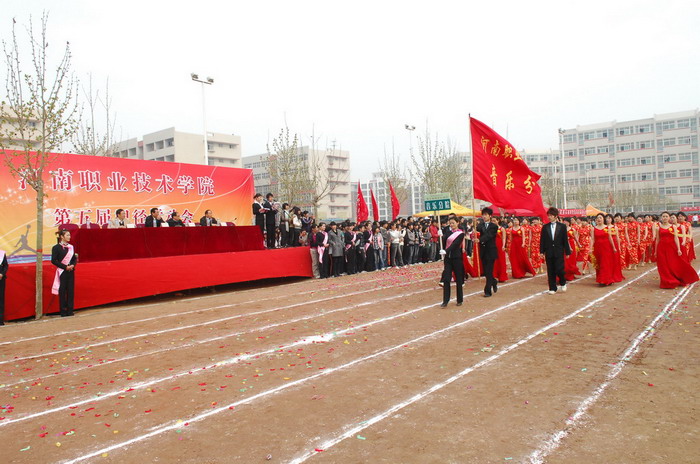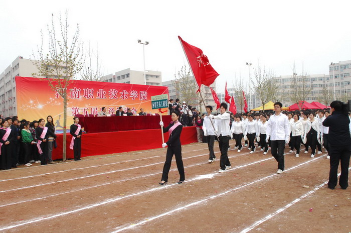庄严嘹亮的国歌声后,院党委书记杨寿亭宣布河南职业技术学院第五届田径运动会开幕。开幕仪式上,院长王爱群同志作了热情洋溢的开幕致辞。他说,学院树立“一切为了学生,为了学生的一切”服务理念,以示范高职建设为重点,加强学院内涵建设,在教学、科研、管理等各个方面,取得了显著成绩,现已成为全国高校毕业生就业工作五十强候选单位。体育教育是学院教学工作的重要组成部分,伴随着学院办学层次的提升,我院体育运动有了较快的发展。广大师生积极投身于形式多样的体育运动,不仅丰富了校园文化生活,也为学院各项事业的发展注入了生机和活力。本届运动会不仅是对我院体育运动的检阅,也是全院学生精神面貌的展示。他预祝本届运动会圆满成功。随后,运动员代表和裁判员代表分别作了宣誓发言。