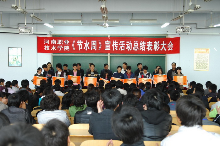 2010年 4月1日下午,我院节水宣传活动总结表彰大会在1101教室举行。郑州市节水办的领导任主任、李主席、杨总工程师及学院王院长、苏院长和团委学生处、后勤管理处的主要领导出席了大会,学院各系部学生代表共计300余人参加了会议。