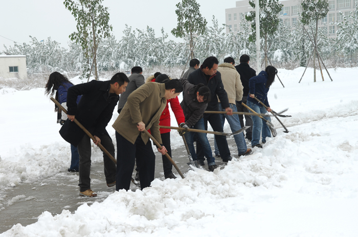 2009年11月11日傍晚开始,全省迎来了一场罕见的大雪,这场大雪给行人和车辆的出行带来了极大的不便。为了确保师生工作、学习、生活不受影响,12日早晨,我院启动应急预案,号召全体教职工清扫校园内的积雪,以保证学院正常的教学和生活秩序。信息工程系积极响应号召,八时半左右,系党总支书记李明玉带着没有课的教职工纷纷走出自己的办公室带着铁锨、扫帚开始铲雪行动。大伙首先清扫了学院大门口的积雪,因为学院大门口是车辆和行人的必经之路,也是最容易发生交通意外的地方。接着又清扫了行政楼附近,图书馆附近的积雪。由于天气寒冷,许多参加扫雪的老师面部、手部冻得通红,但没有一个人退缩,在大家的共同努力下,很快就把铺满积雪的道路给铲出一条小路来,保证了全院师生的安全出行。