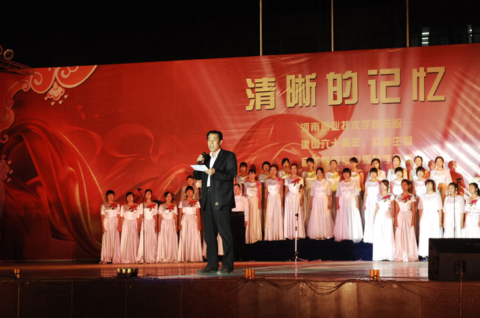 为庆祝建国60周年,活跃校园文化生活。9月28日晚,我院举行了以“清晰的记忆”为主题的庆祝建国60周年文艺演出。省人力资源和社会保障厅机关党委专职副书记白杨林、院党委书记杨寿亭、院长王爱群、副院长彭志宏和苏斌、工会主席郭自川等出席,与教学系部和行政部门负责人及万余名师生一同观看了演出。