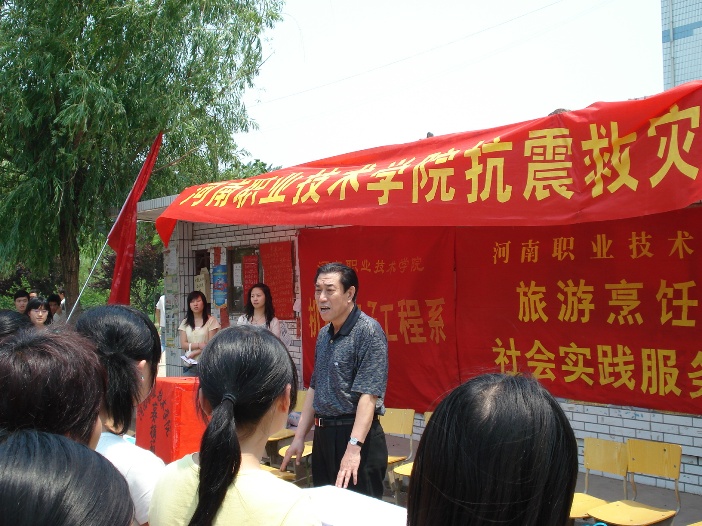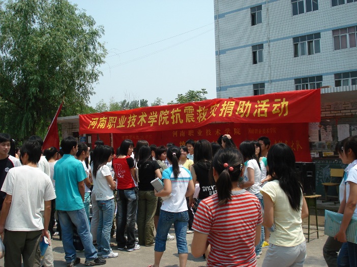 团委学生处于5月19日、20日分别在新、老校区组织了全院共青团员向四川汶川灾区募捐的献爱心活动。院学生会、青年志愿者大队和学生社团制作了大量的宣传海报、条幅及展板,号召全院学生用实际行动支援地震灾区重建家园。院党委书记杨寿亭同志冒着酷暑亲自到募捐现场进行动员。