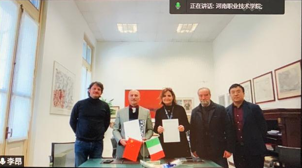 3月10日,河南职院与意大利加尔托斯职业教育学院举行线上签约仪式。校长梅乐堂、副校长王皓,意大利加尔托斯职业教育学院董事长保拉·米萨纳(Paola Missana)、院长迭戈·蒙特隆(Diego Montrone)共同出席签约仪式。