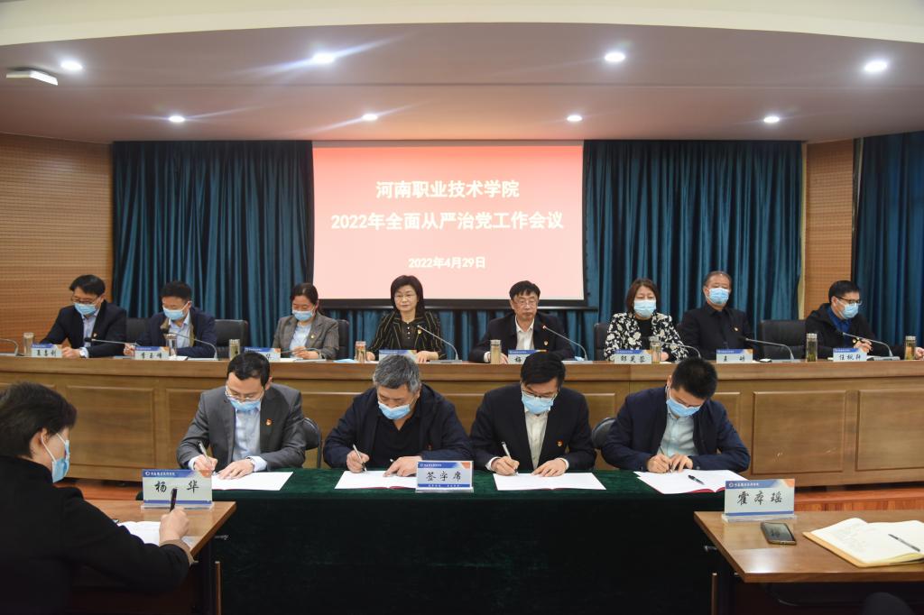 4月29日上午,河南职院2022年全面从严治党工作会议在行政楼238会议室召开。校党委书记李桂贞出席会议并总结我院2021年度全面从严治党工作取得的成效,对2022年的主要工作作出安排部署;校长梅乐堂主持会议并就抓好今年的工作提出要求;校党委副书记、纪委书记田华作2021年党风廉政建设工作报告。校领导及正处级干部参加会议。