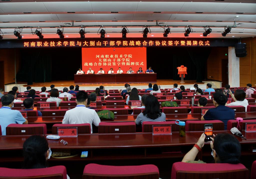 培训期间,我校与大别山干部学院举行了战略合作协议签约暨教育基地揭牌仪式。李桂贞与大别山干部学院党委副书记、常务副院长林志成共同为“河南职业技术学院思想政治暨师德师风教育基地”揭牌;梅乐堂与大别山干部学院副院长曾凡军共同签署了干部教育培训战略合作框架协议。(供稿:郭晓娜;审稿:霍本瑶)