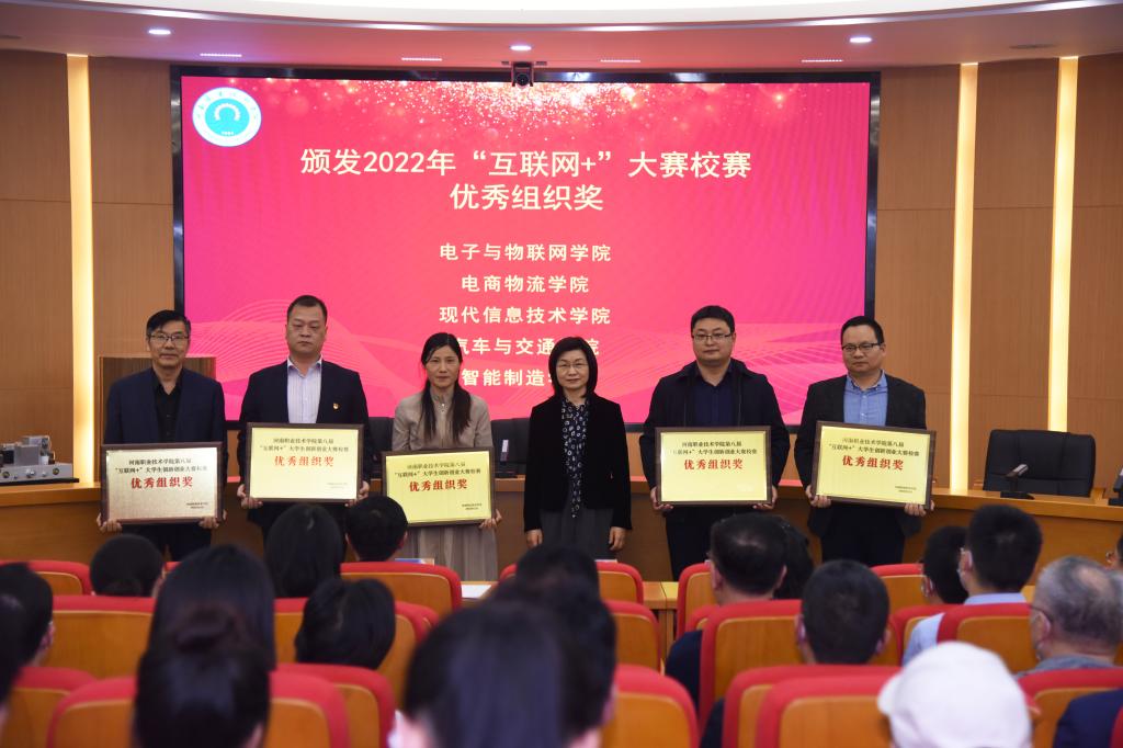 会议现场,播放了学校2022年“互联网+”大学生创新创业大赛成果宣传片;任枫轩宣读了学校2022年“互联网+”大学生创新创业大赛表彰文件;李桂贞分别为获得第八届中国国际“互联网+”大学生创新创业大赛校赛优秀组织奖和获得2022年“青年红色筑梦之旅”活动优秀组织奖的二级学院颁发奖牌。