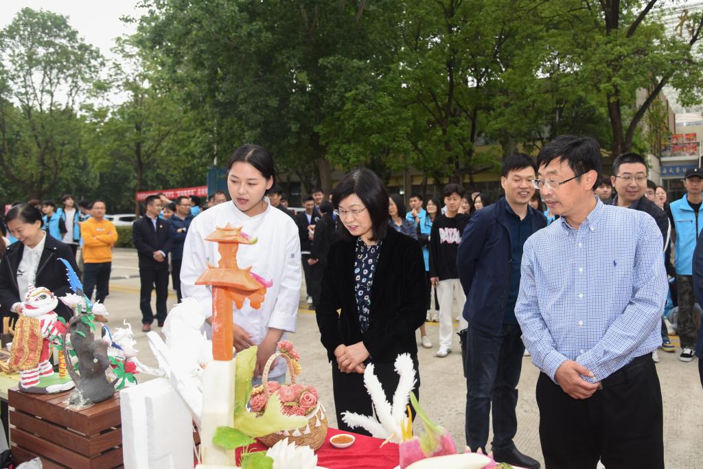 随后,校领导实地参观了学生劳动作品展示。智慧健康学院的“花色冷拼”、电子与物联网学院的“电子管音响”、数字创意与设计学院的“国画团扇、版画”、汽车与交通学院的车辆智能诊断平台和音乐学院的“皮影戏”等各具专业特色的手工作品,吸引在场师生驻足观看。