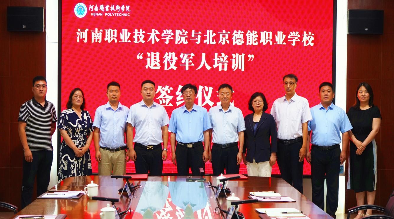 7月3日下午,河南职院与北京德能职业学校举行“退役军人培训”签约仪式。校长梅乐堂、副校长李玉峰,北京德能职业学校校长杨国凯、副校长高木帅,河南知识元教育科技有限公司总经理徐玉霞出席仪式。双方相关部门负责人参加仪式。李玉峰主持仪式。