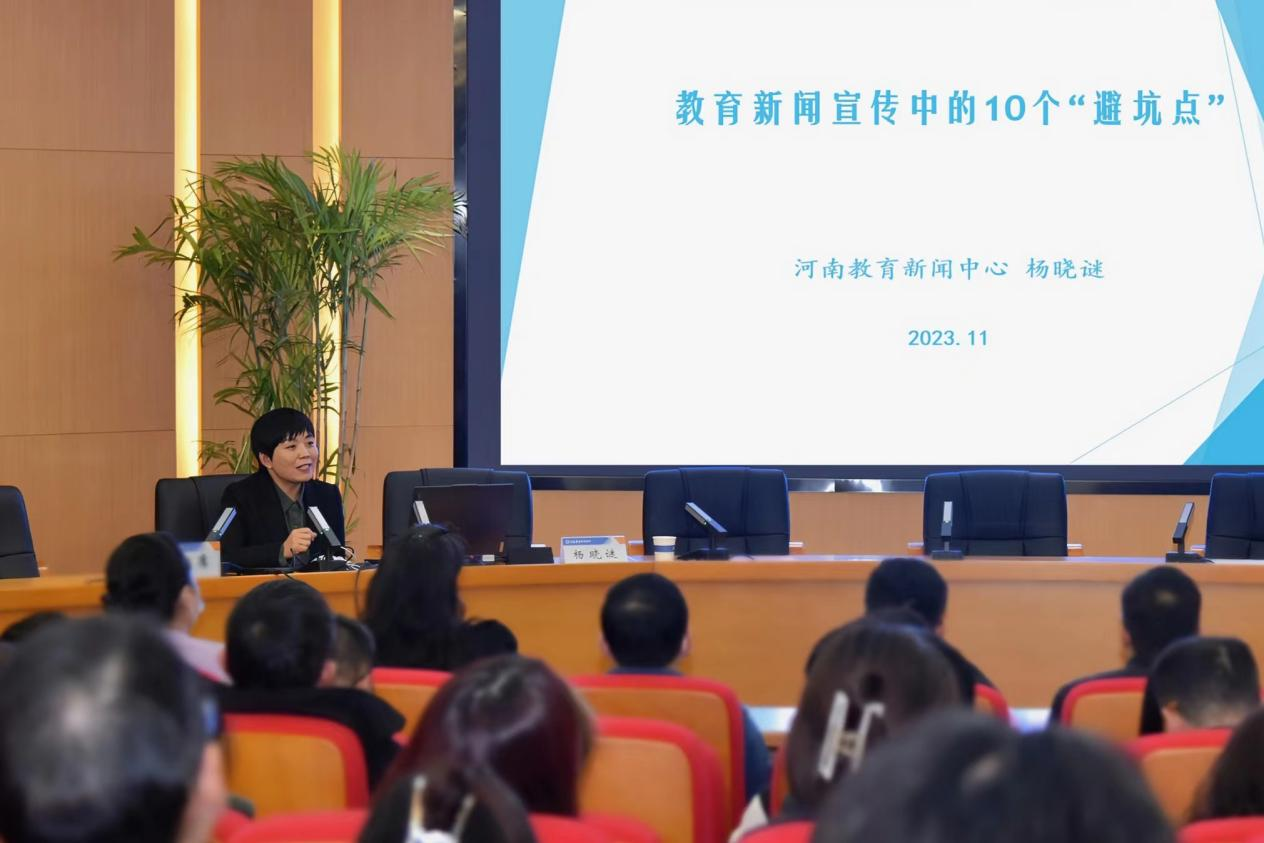 随后,杨晓谜作了题为《教育新闻宣传中的10个“避坑点”》的专题讲座,她结合多年新闻宣传工作经验,分别从新闻中的规范性表述、新闻报道注意事项、新闻细节校对和新闻图片审核等十个方面,对日常新闻宣传工作中应注意的问题进行了详细讲解。报告既有理论高度,又有思想维度,更有实践深度,也有很强的现实针对性和指导性,为学校更好地做好新时期宣传思想工作,提供了根本遵循、指明了科学路径、提供了行动指南。