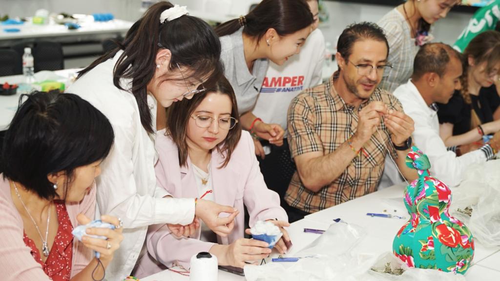 6日下午,校长夏新颜、副校长鲁冬出席了国际教育学院举办的“粽香四溢,非遗端午”中国文化交流活动。夏新颜向外教和留学生送上了节日的祝福和亲切的问候,并详细介绍了端午节在中国传统文化中的重要地位。她指出,端午节是中国的重要传统节日,是承载着深厚文化意义和民族情感的文化符号,希望通过此次活动,全体外教和留学生能够更加深入了解中国文化,深切感受中国非物质文化遗产的魅力。随后,留学生们现场分享了对端午节的相关认识,并在相关师生的指导下包粽子、做扎染香包,体验中国传统技艺乐趣,感受中华优秀传统文化魅力。
