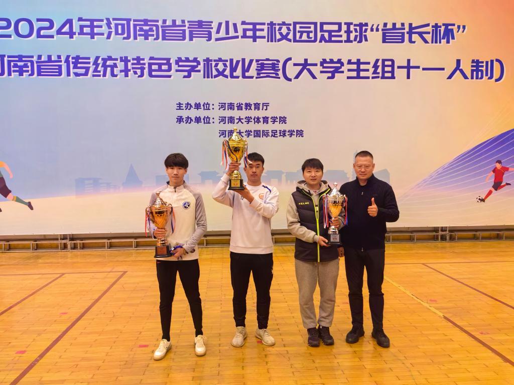 近日,2024年河南省青少年校园足球“省长杯”暨河南省传统特色学校比赛(大学组十一人制)在开封落下帷幕。学校男子足球队凭借出色的表现荣获一等奖;国际教育学院学生崔森森、邓留洋,汽车与交通学院学生艾斯如拉・买买江分获“优秀运动员”称号;基础教学部教师王彬荣获“优秀教练员”称号。