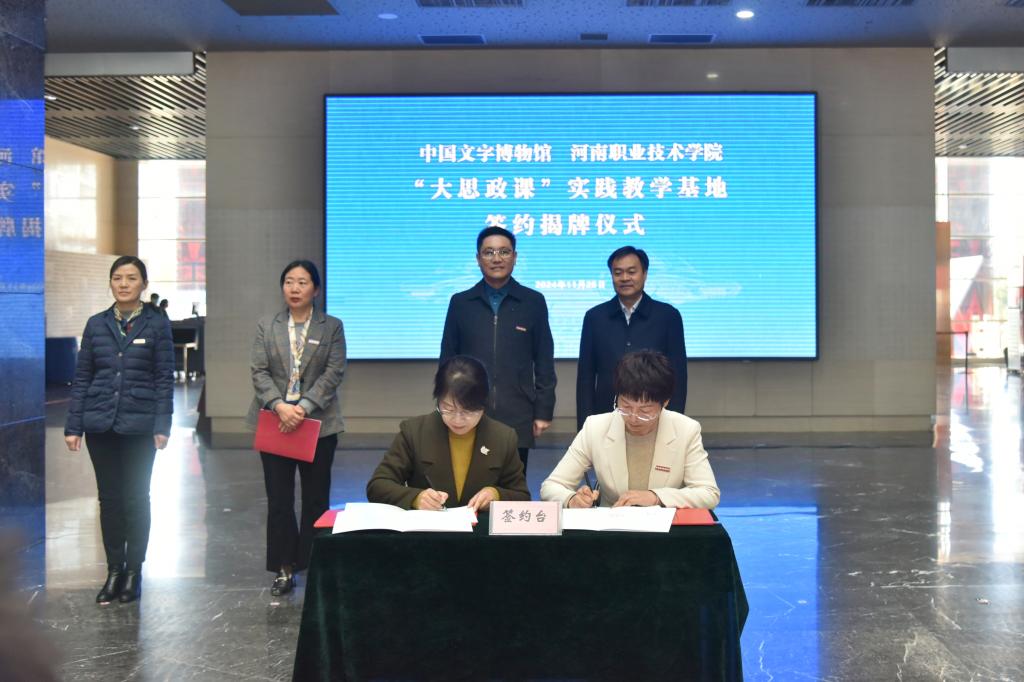 11月28日上午,河南职院与中国文字博物馆举行“大思政课”实践教学基地签约揭牌仪式。校党委书记厉励,中国文字博物馆党委书记、常务副馆长宁红亮出席仪式,并共同为学校“大思政课”实践教学基地揭牌。校党委副书记、工会主席田华,党委委员、组织部部长杨华;中国文字博物馆党委副书记、副馆长、市政府参事李宽生,党委委员、副馆长魏文萃等出席仪式。