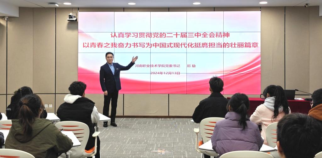 12月13日上午,校党委书记厉励以“认真学习贯彻党的二十届三中全会精神,以青春之我奋力书写为中国式现代化挺膺担当的壮丽篇章”为题,为智能制造学院2024级数控技术专业的同学们讲授了一堂既有思想性、理论性又充满启发性、亲和力的生动思政课。