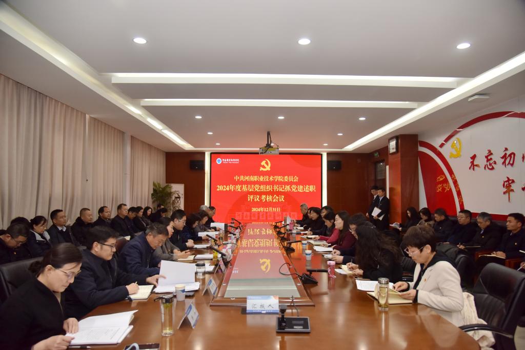 2024年12月31日上午,河南职院召开2024年度党组织书记抓基层党建工作述职评议考核会议。校党委书记厉励主持会议并作点评讲话。全体校党委委员,各学院党总支书记、副书记,直属党支部书记、党政办公室、党委组织部、党委宣传部、纪委办公室、党委教师工作部、党委学生工作部、党委保卫工作部、工会、团委等部门主要负责同志和部分基层党支部书记代表参加会议。