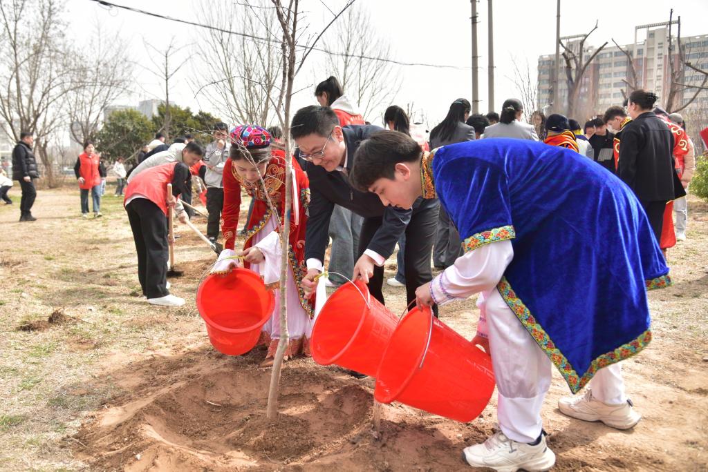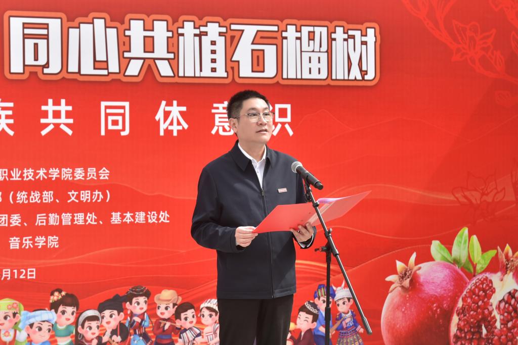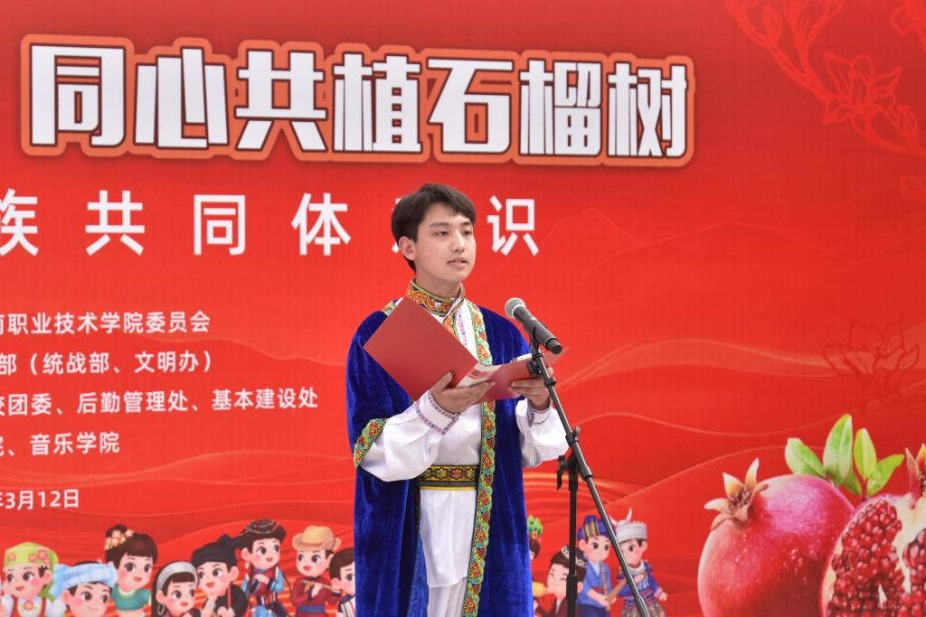 3月12日是全国第47个植树节,当天,河南职院举行了“中华民族一家亲,同心共植石榴树”活动。校党委书记厉励出席活动,为学生讲授铸牢中华民族共同体意识思政课,并为“民族团结石榴林”揭牌。校党委委员、副校长任枫轩,党政办公室、党委宣传部、党委学生工作部、校团委、后勤管理处、基本建设处和各二级学院相关负责人,以及120余名各民族师生代表参加活动。校党委副书记、工会主席田华主持活动。