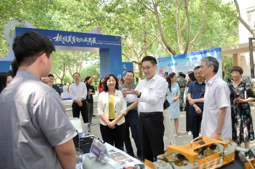 校党委书记厉励,校党委副书记、校长夏新颜在参观过程中与参展师生亲切交流,详细了解美育、文化、科技等相关工作开展情况,对师生们在美育浸润、文化育人、科技创新等方面的积极探索和取得的成果给予了高度评价。校领导指出,大力培育校园美育文化、激发学生科技创新探索热情,是深入学习贯彻习近平新时代中国特色社会主义思想,全面贯彻落实党的二十大、二十届三中全会精神和全国、全省教育大会精神,切实肩负“为党育人、为国育才”崇高使命的重要举措。学校各单位要进一步丰富校园文化内涵,营造浓厚的美育氛围;建立健全科技创新激励机制,将科技成果与社会发展紧密结合,全面提升学生美学素养和科技创新能力水平, 以美育涵养人文情怀,以文化铸魂价值认同,以技能锻造立业之本,构建高质量“三全育人”体系和“大思政”工作格局。校领导鼓励同学们要树立远大志向,钻研磨砺专业技能,积极响应国家创新驱动发展战略号召,努力成为技艺精湛、创新有为的能工巧匠、大国工匠;要主动将中原文化、黄河文化、河职文化融入专业技能实践,在技能锻造中传承文化、彰显创意,为个人成长与行业发展注入新活力;要积极开展多彩校园文化活动,以美学理念赋能专业学习与创新实践,全面提升综合素质,为奋力谱写中原大地推进中国式现代化新篇章贡献更大力量。