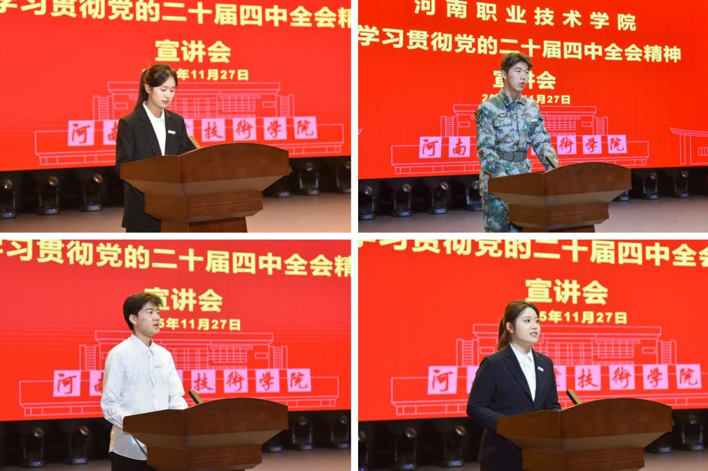 整场报告内容扎实、逻辑严谨、分析透彻、通俗易懂,既具备理论深度,又贴合青年实际,在现场学生中引起强烈反响,在学生代表交流发言环节,省青马学员、控制工程学院电气243班李梦表示,将以全会精神为指引,以青马学员的责任担当为动力,用技能书写青春答卷;校国旗护卫队队长张申奥谈到,将把护旗的责任感融入技能学习,让个人小目标对接国家大发展;现代信息技术学院人工智能技术应用专业段博予表示,将以知识为笔、创新为墨,为高水平科技自立自强贡献青春力量;文化旅游学院团校学员代表史文琪则表示,将把全会精神内化于心、外化于行,走好技能成才之路,扛起青春使命之责,在“十五五”新征程中书写无愧于时代、无愧于国家、无愧于学校培养的青春篇章。