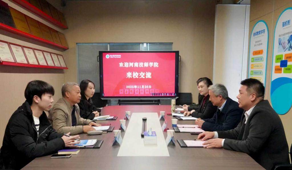11月26日下午,河南技师学院党委委员、副校长杨伟博一行来校,围绕深化校际合作、共谋高技能人才培养新路径开展交流研讨。校党委委员、副校长李玉峰,继续教育学院相关负责人参加交流座谈。