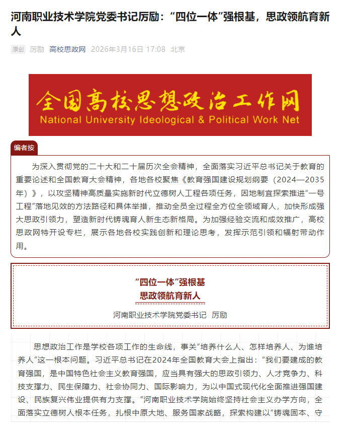 思想政治工作是学校各项工作的生命线,事关“培养什么人、怎样培养人、为谁培养人”这一根本问题。河南职业技术学院始终坚持社会主义办学方向,全面落实立德树人根本任务,扎根中原大地、服务国家战略,探索构建以“铸魂固本、守正创新、强基赋能、凝心聚力”为核心的“四位一体”思政工作体系,持续拓展思政引领的实践路径,着力培养高素质技术技能人才、能工巧匠、大国工匠,为区域经济社会高质量发展提供坚实人才支撑与智力保障。