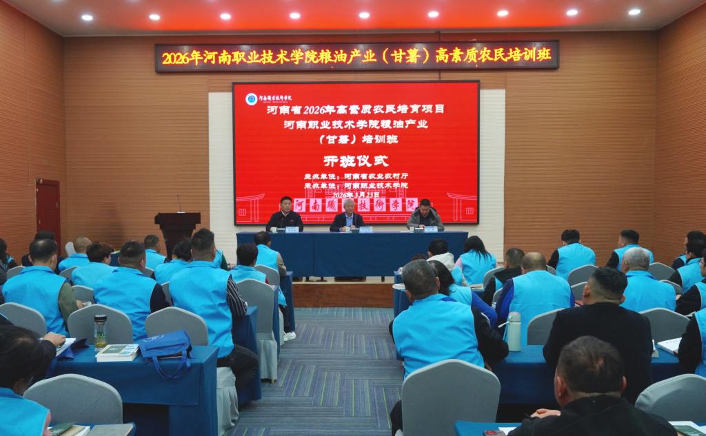 3月23日上午,河南职院2026年高素质农民粮油产业(甘薯)培训班在省农科院现代农业研究开发基地开班。校党委委员、副校长李玉峰,省农业农村厅科技教育处副处长吴辉出席开班仪式。来自省内各地的甘薯种植大户、产业经营主体负责人、乡村产业致富带头人等共计70名学员参加培训。