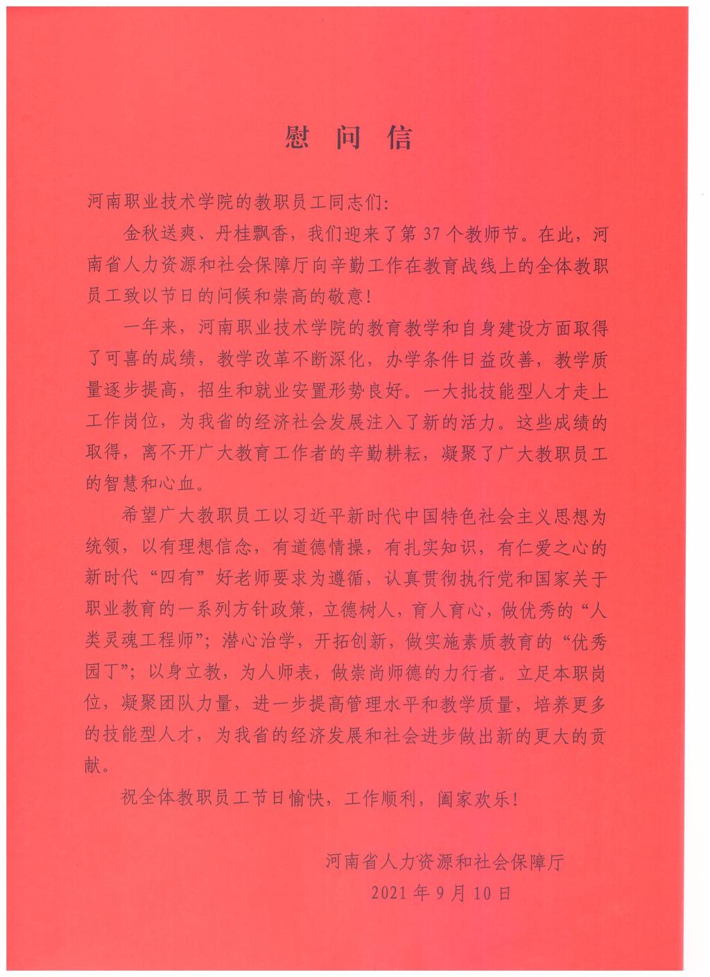 河南省人社厅致我院教职员工慰问信