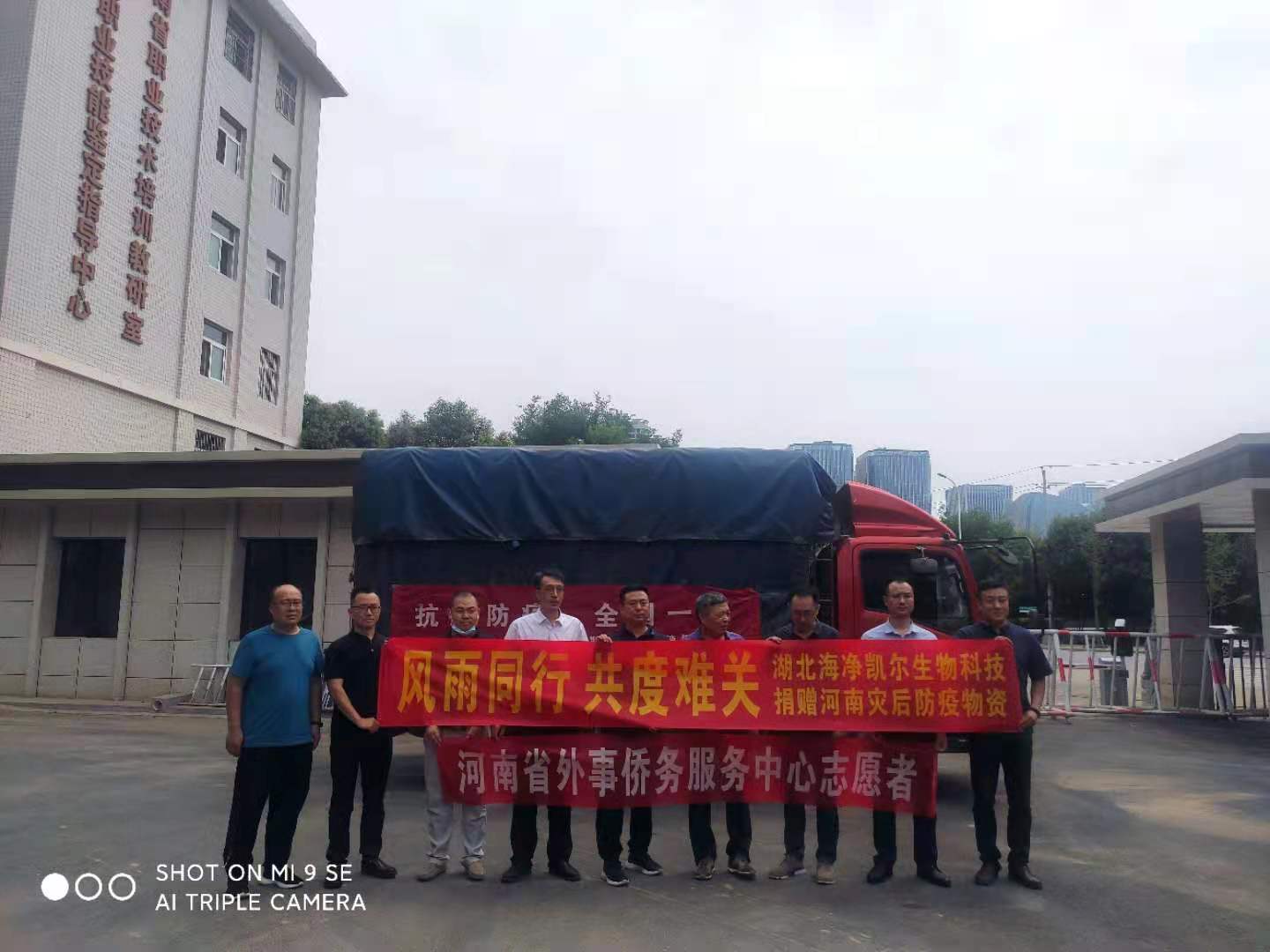 受持续性强降雨天气影响,我校部分楼宇出现大面积积水,形成了校园内涝。突发的灾情牵动着社会各界的心,7月29日上午,在河南省外事侨务服务中心志愿者的指引下,湖北海净凯尔生物科技有限公司向我校捐赠了50箱多用途消毒液,助力我校灾后校园消杀防疫工作。