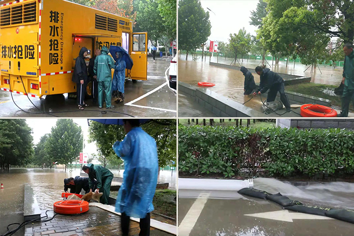 7月20日下午,应学校求助,省水利厅安排防汛抗旱物资储备中心副主任曹长江等一行4名专业人员,配备1台应急排水抢险车和3套大功率排涝设备,冒着特大暴雨,不分昼夜守护现场,协助我校开展排涝抢险。