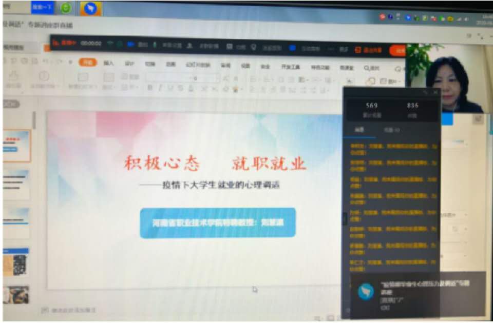 6月15日下午,我校特别邀请郑州大学刘慧瀛教授(我校特聘客座教授)通过钉钉直播课堂作了主题为“积极心理,就职就业——疫情下大学生就业的心理调适”专题网络直播讲座,为毕业生做心理调试,缓解和疏导疫情期间毕业生求职过程中出现的不良情绪。学校招生就业处、心理健康教育中心负责老师,2020届毕业生参加收看了直播讲座。