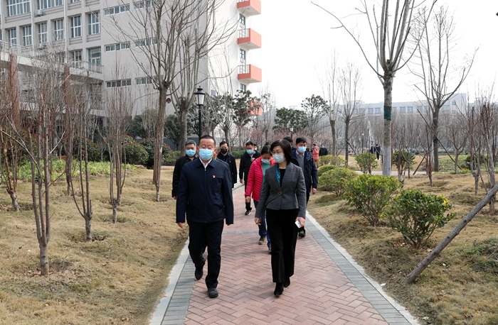 3月6日下午,郑州市郑东新区党工委委员、智慧岛大数据实验区管委会主任陈平山带领社会事业局和教文体局的局长和相关人员,以及辖区街道办领导,到我校调研指导疫情防控工作情况。院领导李桂贞、田华和夏喜利,以及党政办、宣传部、后勤管理处、保卫处等部门的负责人和相关人员陪同调研。