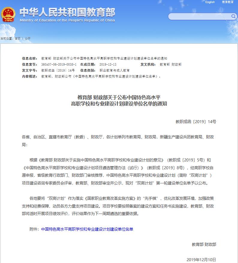 12月18日,教育部、财政部发布了《关于公布中国特色高水平高职学校和专业建设计划建设单位名单的通知》, 我校入选“中国特色高水平高职学校和专业建设计划”(简称“双高计划”)高水平专业群建设单位。这也是我校继国家示范性高等职业院校、国家级优质高等职业院校后,在改革发展中又一新的重大成果。