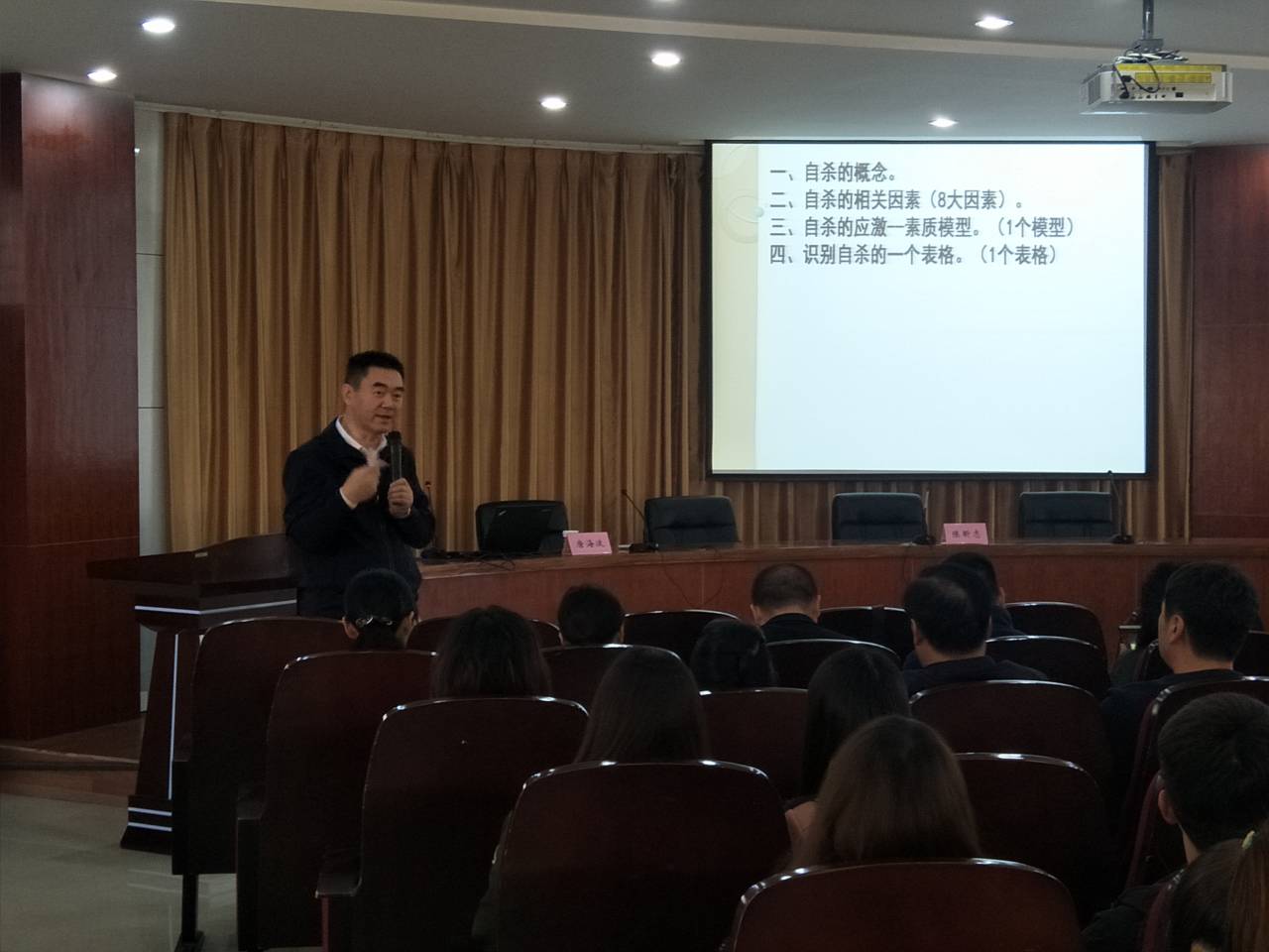 讲座中,唐海波教授深入浅出,首先,把“自杀”的概念进行了细致的解读,让大家走出对“自杀”认识的误区。然后,对形成“自杀”的八大要素逐一进行了分析,以专业的眼光,从专业的角度,介绍了大学生自杀高危人群的识别与干预技术。最后,唐教授将“自杀”的识别方法设计成一个简明易懂的表格供大家参考使用。唐教授的讲座既有准确的理论知识,又有丰富的实操案例,为我们今后开展大学生心理危机预防与干预工作提供了切实有效的帮助,在场的领导和老师们都深受启发。