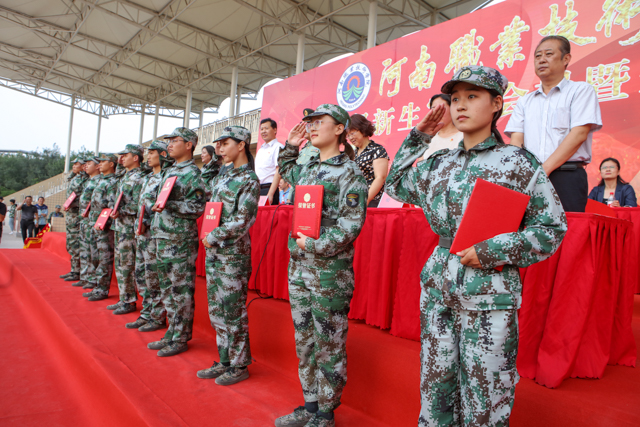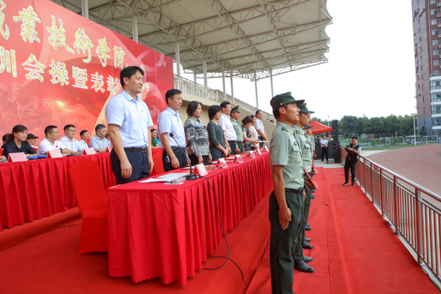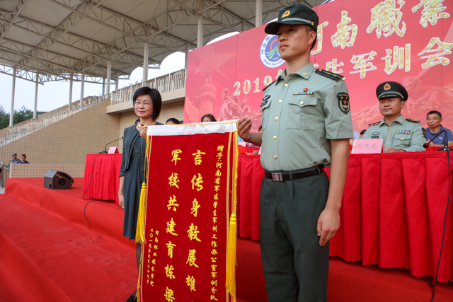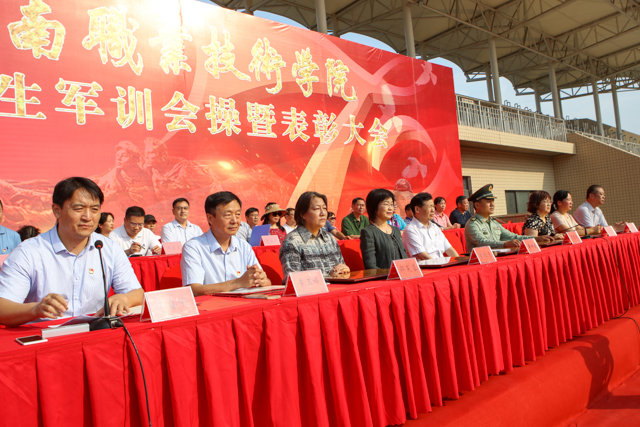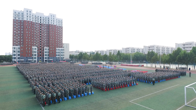 9月29日下午,我校2019级新生军训会操暨表彰大会在体育场隆重举行。河南省军区学生军训办公室部长闵克龙、学校领导和各二级学院党总支书记、副书记、全体新生辅导员,以及军训教官和8000余名新生参加了大会。党委书记李四清下达了军训会操开始指令,院长李桂贞向参训部队赠送锦旗,副院长肖珑宣读了受表彰人员名单,工会主席夏喜利主持大会。