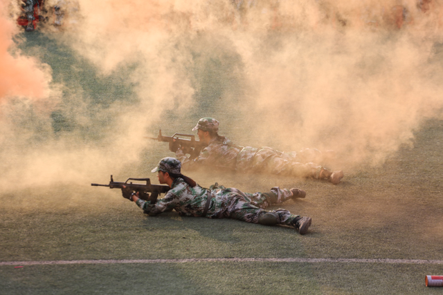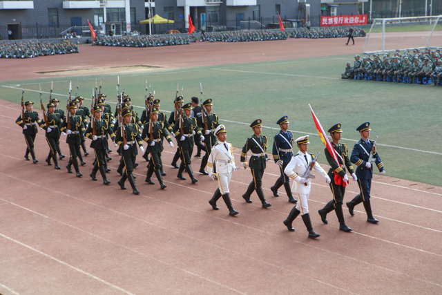 大会伊始,李四清书记下达军训会操开始指令,大会在雄壮的国歌声中拉开帷幕。9个二级学院分列式方队,身着迷彩精神抖擞,正步通过主席台,接受与会领导的检阅。他们目光坚定、步伐自信、口号嘹亮、斗志昂扬,处处洋溢着青春的活力,更彰显着2019级河职新生顽强拼搏、锐意进取的精神。特别在擒敌拳、匕首操、心肺复苏、战术综合四项演练表演中,同学们高标准的战术动作、高素质的执行能力、高精准的团队协作和高沸点的雷霆之气,深深带动和感染者在场的所有领导和师生,大家热血沸腾、掌声不息。