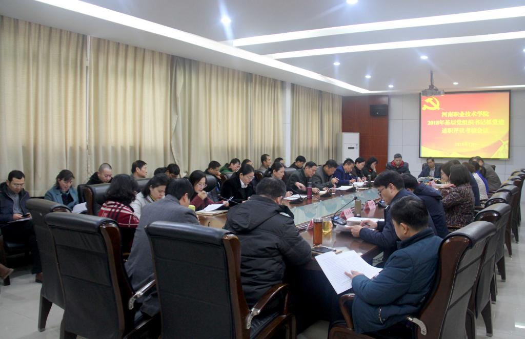 1月9日上午,我校在行政楼332会议室,召开了2018年度基层党组织书记抓党建述职评议考核会议。校党委全体成员、各党总支、直属党支部书记和机关各党支部书记共37人参加了会议。院党委副书记、院长李桂贞同志主持会议。