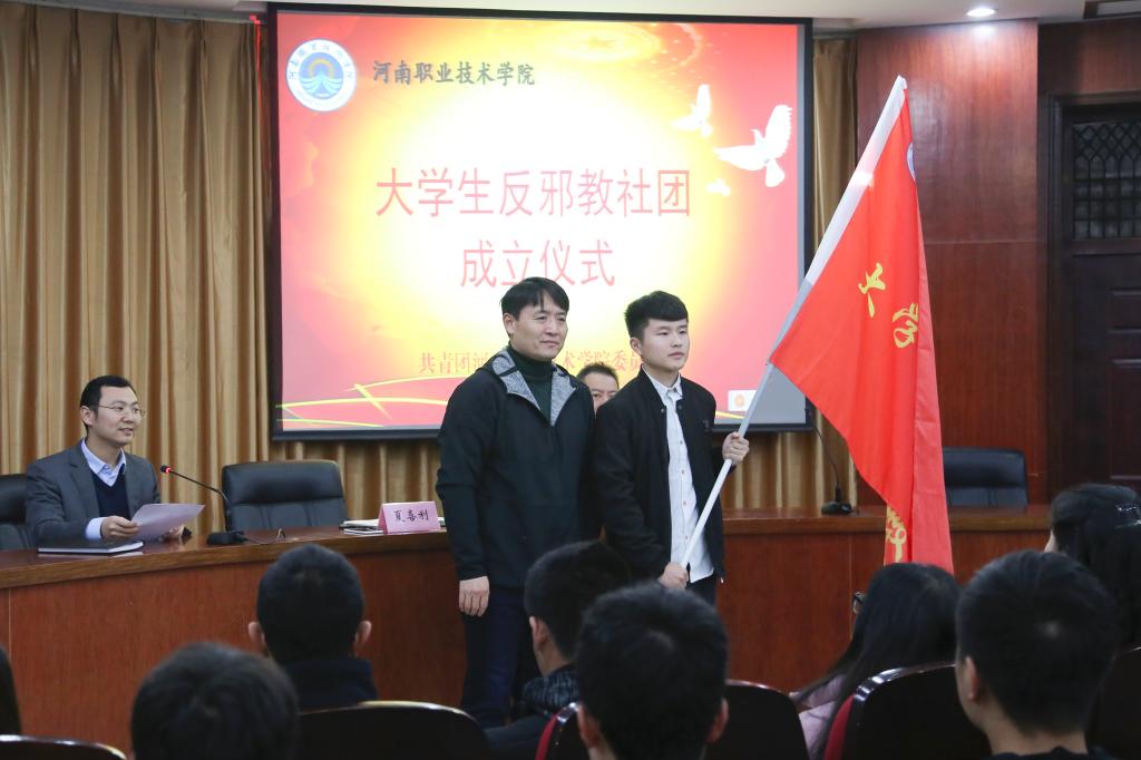 成立仪式上,工会主席夏喜利向大学生反邪教社团授旗,并作动员讲话。他首先代表学校党委,向大学生反邪教社团的成立表示祝贺。他强调,意识形态工作是高校思想政治工作的重要组成部分,而邪教具有反科学、反人类、反社会、反政府的本质,同学们要保持清醒头脑,提高辨别邪教渗透的能力,积极宣传反邪教知识。同时,他还对该社团首批成员提出了四点要求:一是认清形势,统一思想,充分认识到在高校成立反邪教社团的重要性和必要性;二是牢记责任,履行职责,严加防范治理,让邪教在校园内无立足之地;三是健全机制,创新载体,既要积极参加河南省、郑州市反邪教组织的宣传教育活动,又要与兄弟院校的同类社团相互学习交流,发挥反邪教社团的重要作用,共同维护校园安全稳定;四是探索在新形势下反邪教斗争的新办法、新途径,以达到普及科学知识、传播科学思想、弘扬科学精神、提高大学生抵御邪教诱惑的能力。(供稿:张萧予,审稿:朱永宽)