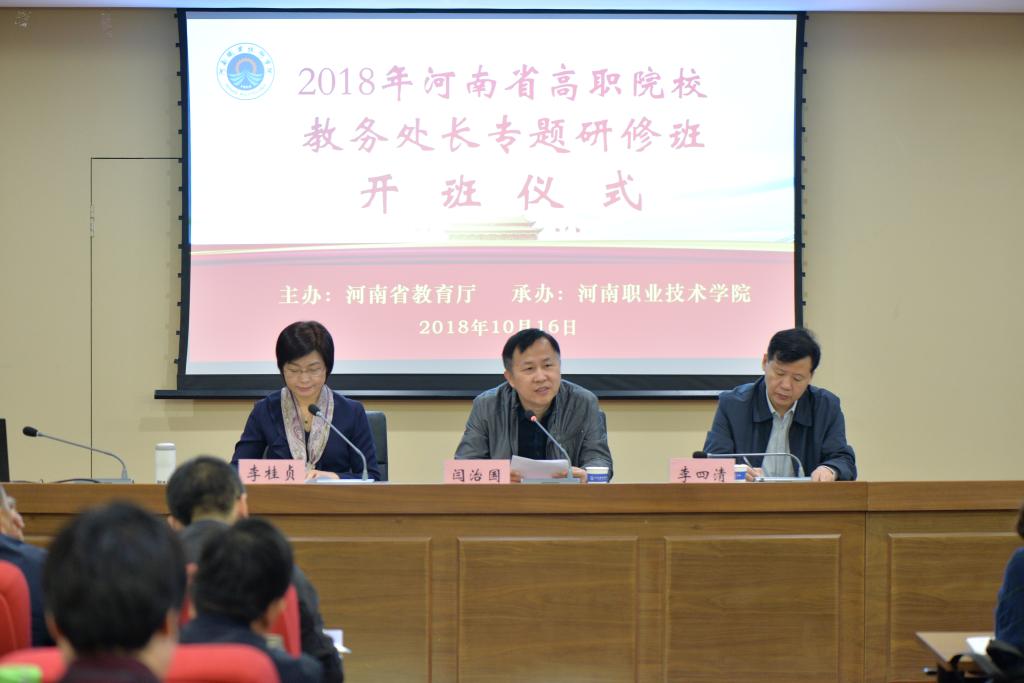 金秋十月,丹桂飘香。10月16日上午,河南省高等职业院校教务处长专题研修班开班典礼在我校举行。省教育厅高教处副处长闫治国出席开班典礼并作了讲话,学校党委书记李四清、院长李桂贞、副校级领导和来自全省81位高职院校教务处长,以及我校二级学院院长、副院长,党政办、宣传部和教务处相关工作人员共140余人参加了开班典礼。开班典礼由李桂贞院长主持。