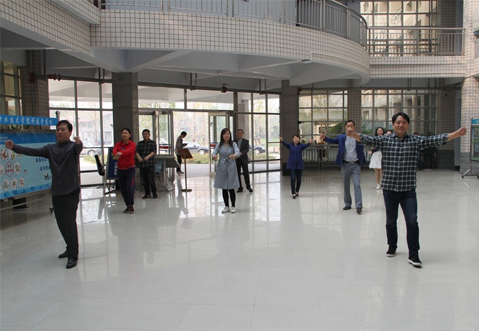 10月15日上午,在行政楼一楼大厅,机关三个分会的教职工随着第九套广播体操的音乐及节拍,积极认真地做好每一个动作。校工会主席夏喜利与30多人参加。其他分会在各自地点认真组织做好工间操。