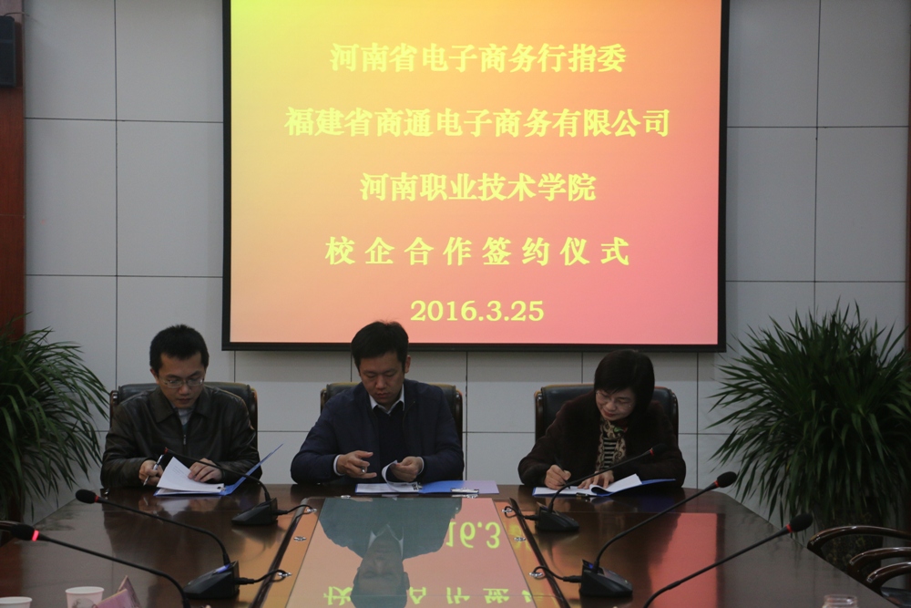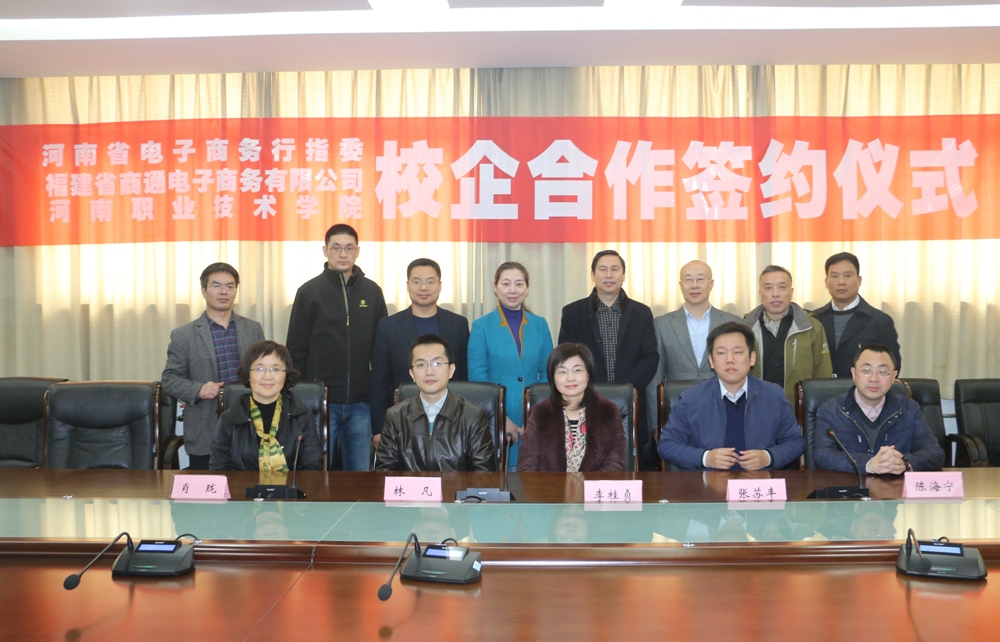 3月25日上午,在河南省电子商务行业职业教育校企合作指导委员会的指导和帮助下,我院与福建商通电子商务公司签订校企战略合作协议。河南省电子商务协会秘书长张苏丰,福建省商通电子商务有限公司CEO林凡和总经理陈海宁,学院院长李桂贞和副院长肖珑以及合作办学处、信息工程系相关领导参加签约仪式。签约仪式由副院长肖珑主持。