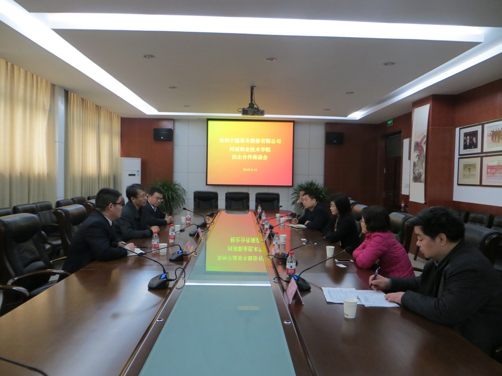 3月15日下午,郑州宇通客车股份有限公司人力资源部副总监李育涛一行3人,来我院洽谈校企合作事宜。李总监一行在参观完汽车工程系实训中心后,与学院领导就校企双方如何更好地深入开展校企合作,进一步做好专业共建、实习基地共建和技术研发等问题进行了深入交流。院长李桂贞、副院长肖珑及合作办学处、汽车工程系相关领导参加了座谈会。