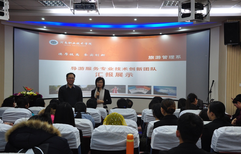 12月28日下午,院长李桂贞在教务处处长周宗杰的陪同下,来到旅游管理系,对该系两个专业技术创新团队——“导游服务专业技术创新团队”和“中餐主题宴会设计创新团队”的学习效果进行检查指导,并与团队师生进行了交谈。