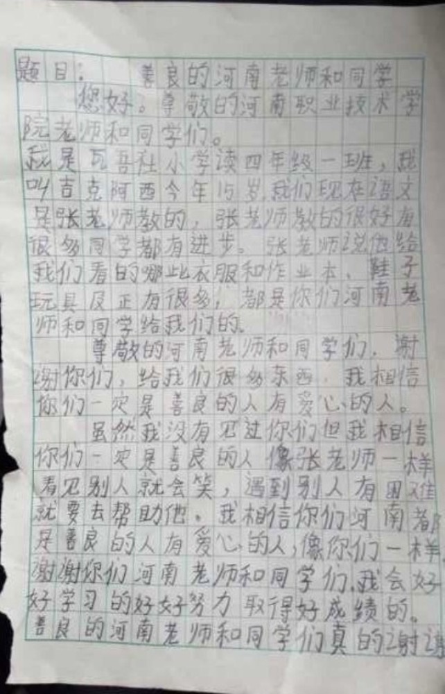 瓦吾社小学是该系2014届优秀毕业生张磊同学所支教的山村小学,同学们收到邮寄来的学习和体育用品后十分激动和开心。其中吉克阿西小朋还发自内心地给环艺系的叔叔阿姨、哥哥姐姐们写了一封题为“善良的河南老师和同学”的感谢信,她在信中这样写到“尊敬的河南职业技术学院老师和同学,我真的要感谢你们,感谢你们对我们瓦吾社小学的爱,还有感谢你们给我们瓦吾社小学这么多好东西,真的要谢谢你们。希望你们收到这封信要高兴,虽然我写的不好,但我写的这些话都是我心里话,我希望你们能喜欢…”。该系师生看到来信后都被孩子们的懂事和质朴而感动,更为孩子们生活的困苦、学习的匮乏和窘迫而忧心。该系师生纷纷表示将会继续关注这些大山里的孩子,发动身边的同事和同学们给予他们更多的关爱和支持,把我们河职爱心正能量永远传递下去,为社会做出更大的贡献。